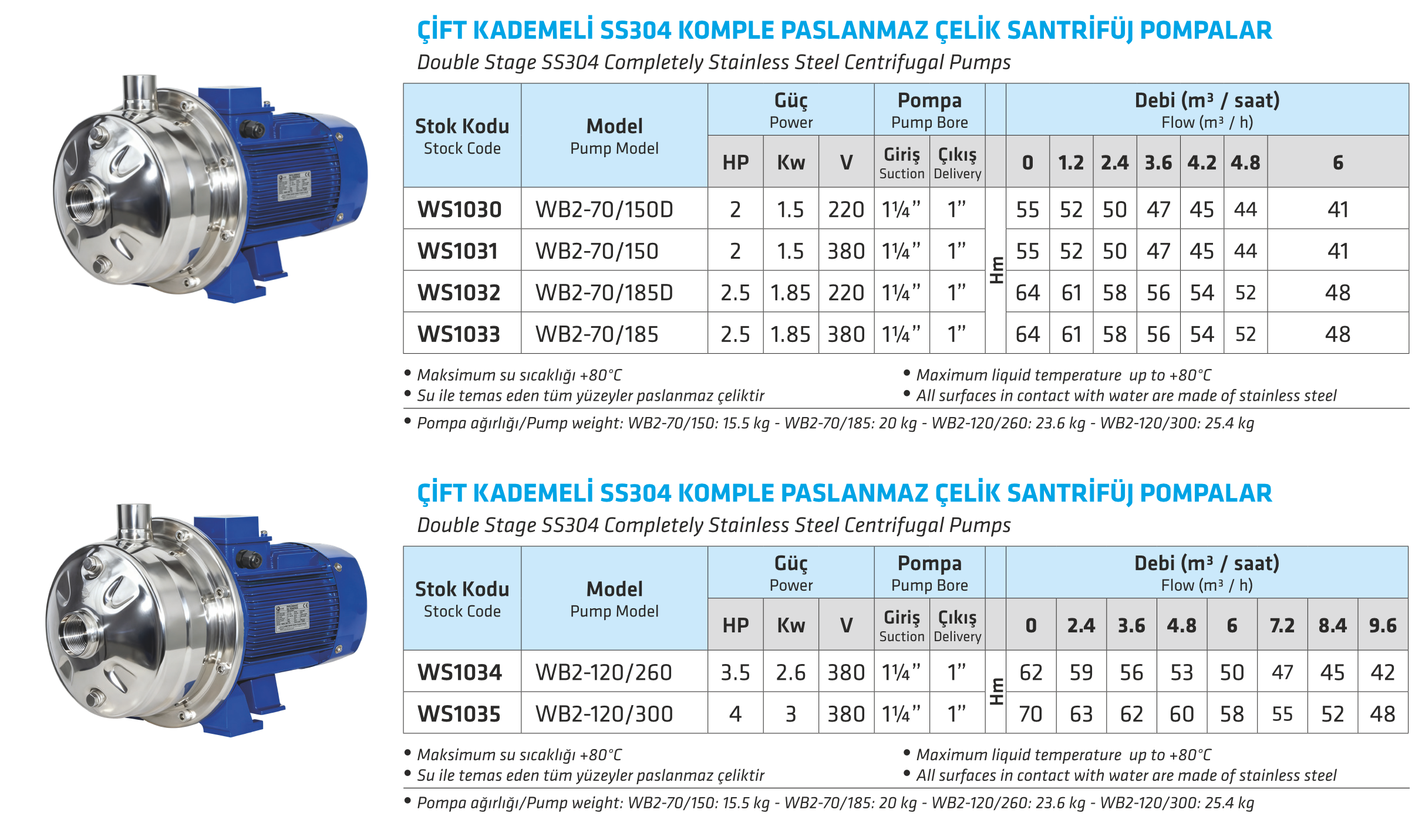 ÇİFT KADEMELİ SS304 KOMPLE PASLANMAZ ÇELİK SANTRİFÜJ POMPALAR