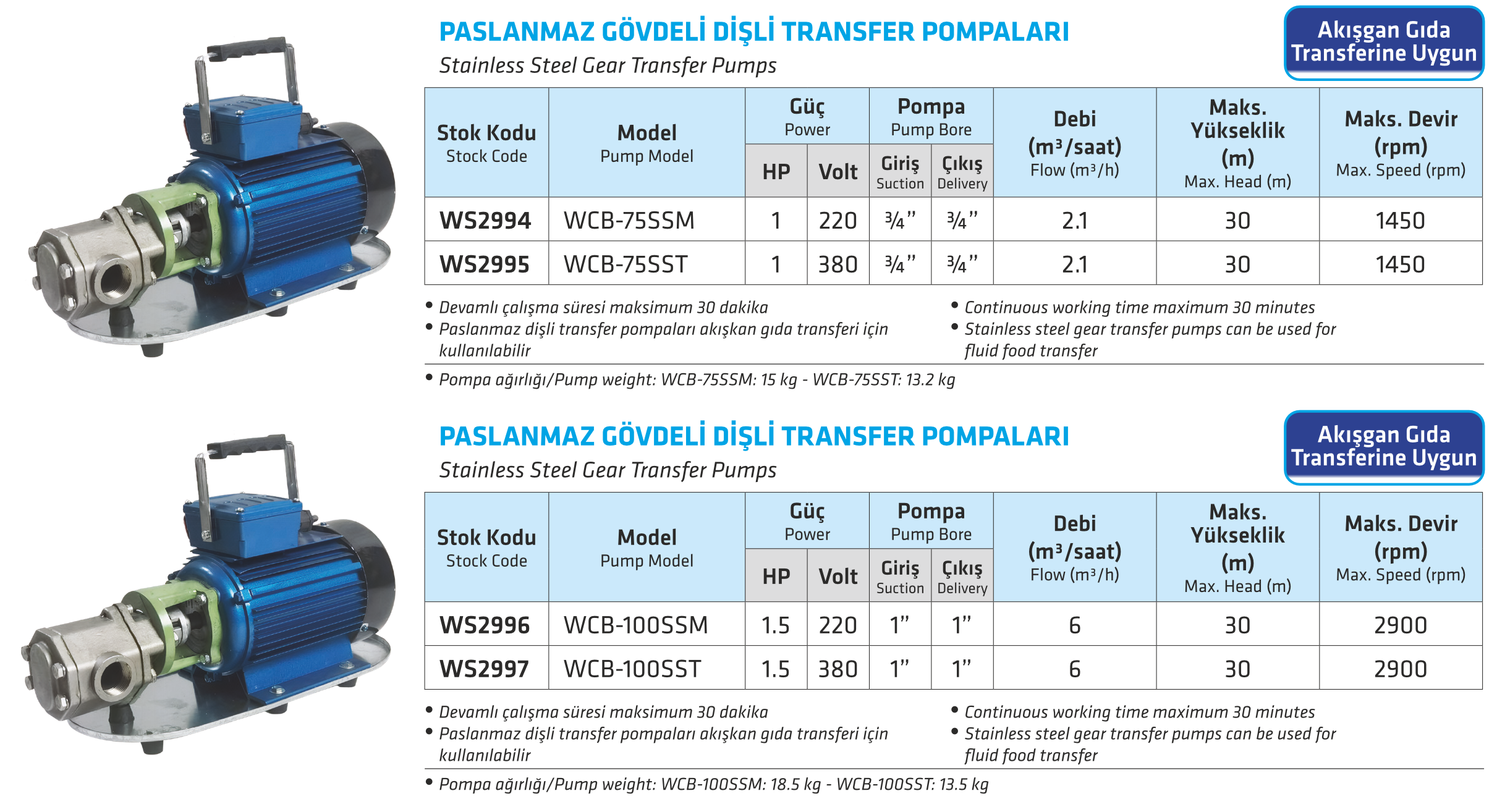 PASLANMAZ GÖVDELİ DİŞLİ TRANSFER POMPALARI