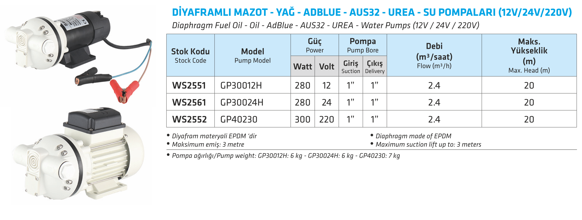 DİYAFRAMLI MAZOT - YAĞ - ADBLUE - AUS32 - UREA - SU POMPALARI (12V/24V/220V)