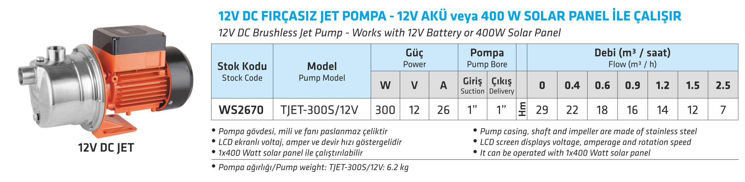 24V DC Fırçasız Jet Pompa - 24V Akü Veya 550 W Solar Panel ile Çalışır