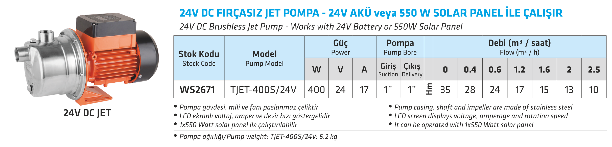 24V DC FIRÇASIZ JET POMPA - 24V AKÜ VEYA 550 W SOLAR PANEL İLE ÇALIŞIR