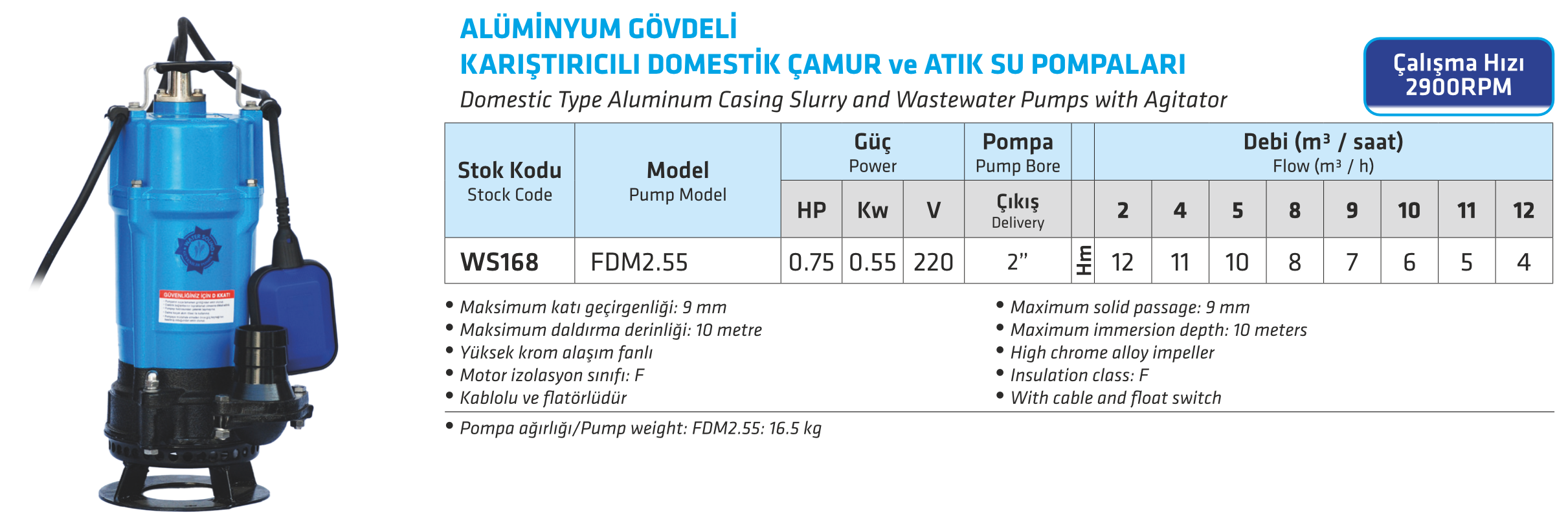 ALÜMİNYUM GÖVDELİ KARIŞTIRICILI DOMESTİK ÇAMUR VE ATIK SU POMPALARI