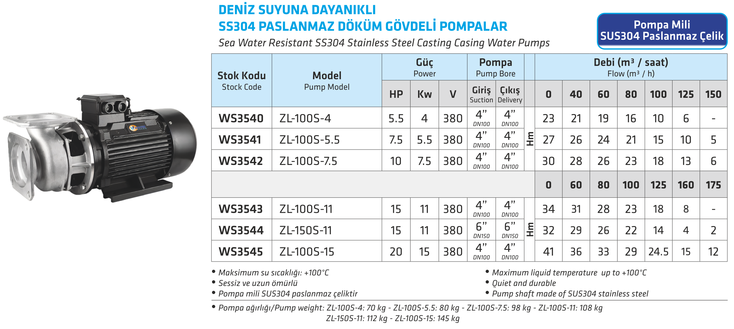 DENİZ SUYUNA DAYANIKLI SS304 PASLANMAZ DÖKÜM GÖVDELİ POMPALAR
