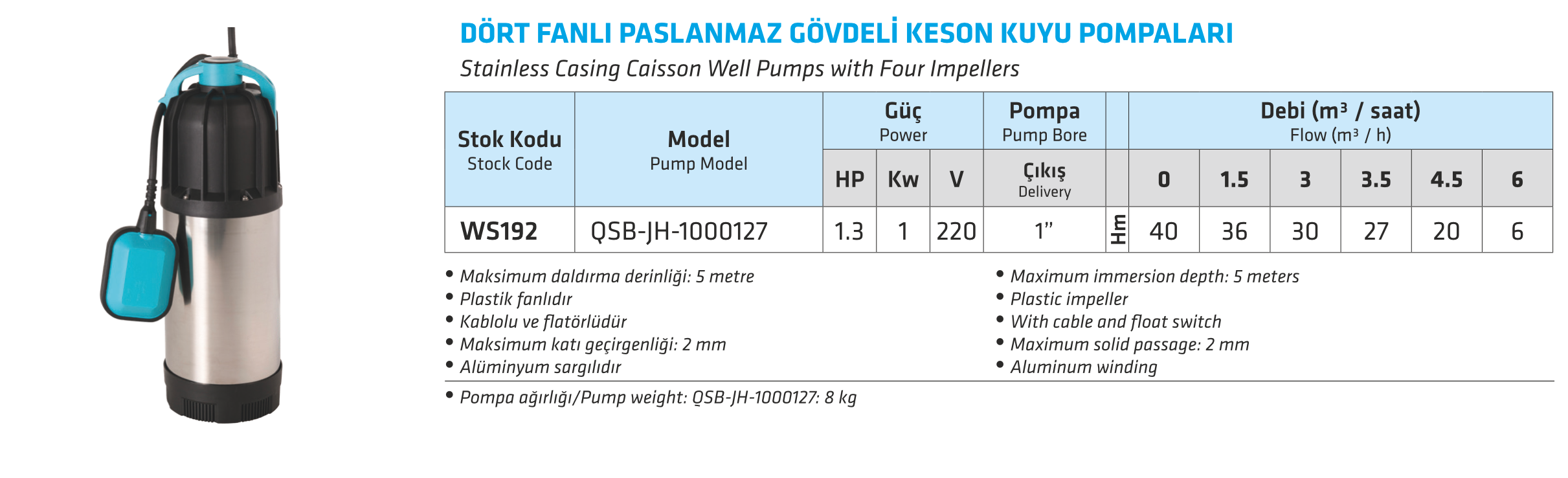 Tek Fanlı Paslanmaz Gövdeli Keson Kuyu Pompaları