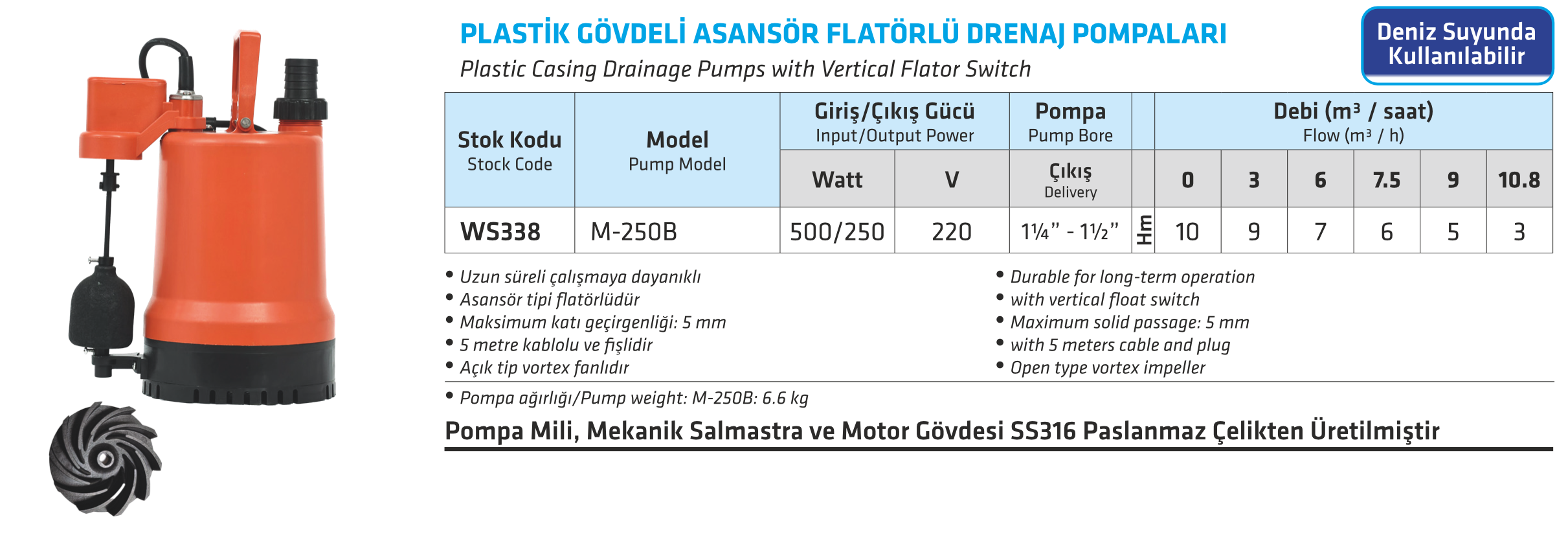 Plastik Gövdeli Asansör Flatörlü Drenaj Pompaları